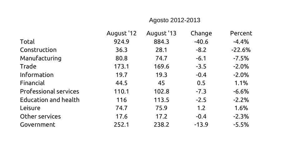 De acuerdo con el informe REGIONAL AND STATE EMPLOYMENT AND UNEMPLOYMENT — AUGUST 2013 publicado hoy por el Bureau of Labor Statistics del Departamento del Trabajo de Estados Unidos, el empleo asalariado no-agrícola en Puerto Rico se redujo de 924,900 en agosto de 2012 a 884,300 en agosto de 2013, una reducción de 40,600 empleos, equivalente a un 4.4%, en un periodo de 12 meses. La tabla a continuación contiene un desglose por sector económico: