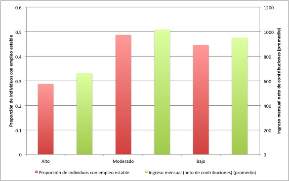 Gráfico: Ingreso mensual neto (promedio) y proporción de personas con empleo estable,